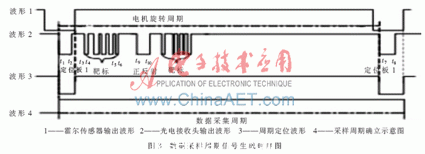 首先以霍爾傳感器輸出波形為粗定位(波形1),從PIN輸出的數(shù)字脈沖信號(hào)(波形2)中提取出采樣周期定位波形,然后以此定位波形為基礎(chǔ)定位出數(shù)據(jù)采樣周期,在整個(gè)數(shù)據(jù)采樣周期內(nèi)對(duì)數(shù)字脈沖信號(hào)進(jìn)行計(jì)數(shù)填充。采樣周期定位脈沖(波形3)的下降沿是以PIN輸出信號(hào)的定位脈沖的下降沿來(lái)定位的,其上升沿是以霍爾傳感器輸出脈沖的上升沿來(lái)定位的。提取出來(lái)的采樣周期定位波形如圖3中波形3所示。
