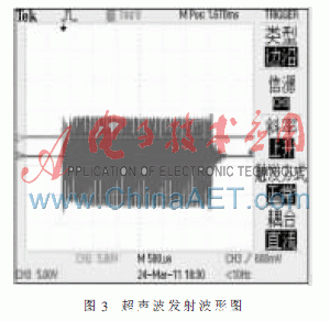 在超聲波測距系統(tǒng)中, 40 kHz的超聲波信號是最理想的信號,而紅外的最佳頻率為38 kHz。其硬件組成電路如圖2所示。在超聲波發(fā)射電路中,由R4、C9和D1構(gòu)成D-R-C吸收電路來保證三極管Q1能夠穩(wěn)定可靠地工作,而不會損壞。紅外的38 kHz和超聲波的40 kHz頻率的方波由STM8單片機的定時器產(chǎn)生。圖3為超聲波電路中L2和超聲波探頭P1以及C10共振的波形圖,衰減了10倍。圖4為紅外發(fā)射波形圖。