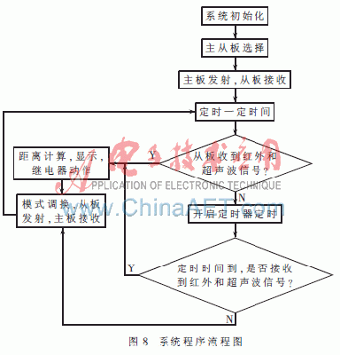 STM8單片機控制器主要完成紅外和超聲波的中斷響應(yīng)、發(fā)射定時以及產(chǎn)生38 kHz和40 kHz的方波來驅(qū)動各自的三極管以及紅外與超聲波接收信號的濾波、數(shù)據(jù)處理、距離計算和實測距離的顯示。系統(tǒng)程序流程如圖8所示。