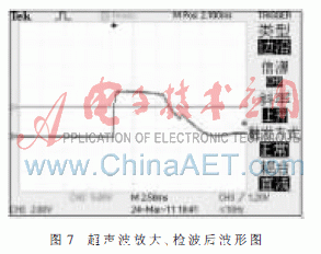 圖7為超聲波接收端波形放大及經(jīng)典的二極管檢波電路之后輸出的超聲波接收端信號波形,其通過比較器輸入到STM8單片機的另一個捕獲引腳來控制定時器的停止。
