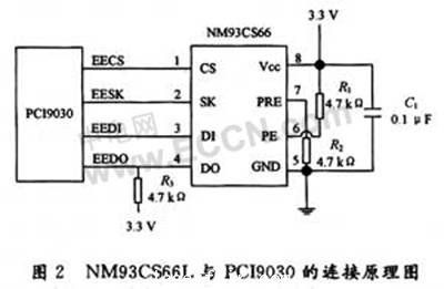E2PROM用來對(duì)完成PCI9030的初始化,在整個(gè)系統(tǒng)中起著極其重要的作用。本系統(tǒng)的E2PROM選用National公司的NM93CS66L。它是一個(gè)4 kB的低功耗串行存儲(chǔ)器,用來存儲(chǔ)PCI9030的配置信息并在芯片復(fù)位時(shí)進(jìn)行加載,從而使運(yùn)動(dòng)控制卡具有即插即用的功能。其與PCI9030的連接原理圖如圖2所示。其中,NM93CS66L的片選信號(hào)CS、串行時(shí)鐘信號(hào)SK、數(shù)據(jù)輸入DI和數(shù)據(jù)輸出信號(hào)DO分別與PCI9030對(duì)應(yīng)的信號(hào)相連;保護(hù)寄存器使能信號(hào)PRE接地來使能對(duì)存儲(chǔ)空間的操作,同時(shí)禁止對(duì)保護(hù)寄存器的操作;編程使能信號(hào)PE接3.3 V來允許對(duì)存儲(chǔ)區(qū)的操作。