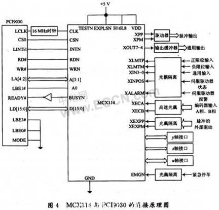 MCX314與PCI9030的連接原理圖如圖4所示。PCI9030具有可編程的片選信號(hào),可通過配置片選基地址寄存器使得在某一局部地址范圍內(nèi)產(chǎn)生片選信號(hào),這樣就節(jié)省了譯碼電路,使得應(yīng)用更加方便。通過對(duì)局部地址總線寄存器進(jìn)行配置,將PCI9030的數(shù)據(jù)總線配置為16位,此時(shí)LBEI#就作為L(zhǎng)Al來使用。