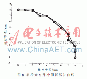 圖9所示為當(dāng)插補(bǔ)半徑為800個(gè)脈沖當(dāng)量時(shí)軌跡情況??梢钥闯?,對(duì)于任何實(shí)際執(zhí)行的圓弧指令(半徑一般大于1 000個(gè)脈沖當(dāng)量),如此細(xì)小的誤差完全可以忽略不計(jì)。使用最小偏差法實(shí)現(xiàn)圓弧插補(bǔ),流程明確,又是整數(shù)計(jì)算,特別適合基于FPGA的設(shè)計(jì)。而且準(zhǔn)確性已非常高,所以使用最小偏差法來進(jìn)行圓弧的精插補(bǔ)是最優(yōu)方案。