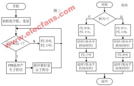 此函數(shù)為帶參數(shù)DLYLEVEL,約產(chǎn)生DLYLEVEL*400us的延時(shí),因此一個(gè)脈沖周期可以由高電平持續(xù)時(shí)間系數(shù)hlt和低電平持續(xù)時(shí)間系數(shù)llt組成,本設(shè)計(jì)中采用的脈沖頻率為25Hz,可得hlt+llt=100,占空比為hlt/(hlt+llt),因此要實(shí)現(xiàn)定頻調(diào)寬的調(diào)速方式,只需通過(guò)程序改變?nèi)肿兞縣lt,llt的值,該子程序流程圖如圖四。