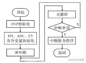 系統(tǒng)控制程序分為兩部分,即主程序和中斷服務(wù)子程序。主程序完成初始化后進(jìn)入循環(huán)。中斷服序程序主要完成系統(tǒng)各種控制策略,包括電機(jī)定子電流和電壓采樣,完成電流、電壓的A/D轉(zhuǎn)換。利用正交編碼單元處理速度反饋信號(hào)。根據(jù)各種控制算法輸出PWM信號(hào)對電機(jī)轉(zhuǎn)矩進(jìn)行控制。系統(tǒng)主程序流程圖如圖4所示。