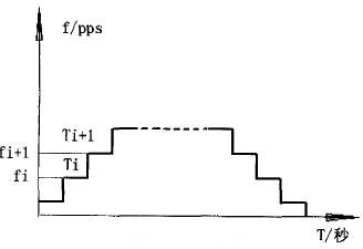 在該電路中,將P1.0口設(shè)為電機開始按鈕,P1.1,P1.2,P1.3為速度選擇按鈕。速度由低到高,P1.4為電機停止按鈕。并設(shè)三檔速度的最高速度依次為500pps、1000pps、2000pps 。RXD,TXD 已由MAX232電平轉(zhuǎn)換接出串口。此外,步進電機其啟動,停止的頻率較低,一般在100-250Hz之間,而最高運行頻率要求較高。通常為1-3kHz,為使其在啟動、運行和停止整個過程中,既不會失步,又能夠盡快精確地達到目標位置,運行速度都要有一個加速一恒速減速的過程。這里采用常用的離散辦法來逼近理想的近似梯形的升降速曲線,如圖5所示。即利用定時器中斷方式來不斷改變定時器裝載值的大小。