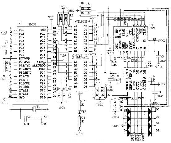 步進電動機是一種將電脈沖信號轉(zhuǎn)換成角位移或線位移的精密執(zhí)行元件,由于步進電機具有控制方便、體積小等特點,所以在數(shù)控系統(tǒng)、自動生產(chǎn)線、自動化儀表、繪圖機和計算機外圍設(shè)備中得到廣泛應(yīng)用。微電子學的迅速發(fā)展和微型計算機的普及與應(yīng)用,為步進電動機的應(yīng)用開辟了廣闊前景,使得以往用硬件電路構(gòu)成的龐大復(fù)雜的控制器得以用軟件實現(xiàn),既降低了硬件成本又提高了控制的靈活性,可靠性及多功能性。市場上有很多現(xiàn)成的步進電機控制機構(gòu),但價格都偏高。應(yīng)用SGS公司推出的L297和L298兩芯片可方便的組成步進電機驅(qū)動器,并結(jié)合AT89C52單片機進行控制,即可以實現(xiàn)用相對便宜的價格組成一個性能不錯的步進電機驅(qū)動電路。