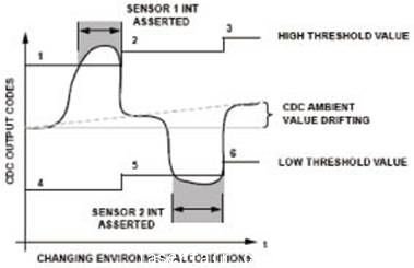 隨著環(huán)境條件的變化(例如,溫度或濕度上升),傳感器的環(huán)境參數(shù)(在用戶沒(méi)有與傳感器接觸期間,由CDC進(jìn)行測(cè)量)會(huì)發(fā)生漂移。為了進(jìn)行補(bǔ)償,需要?jiǎng)討B(tài)改變高端和低端閾值電平,以確定有效的傳感器接觸。位置2、3、5、6處的參考電平進(jìn)行重新調(diào)整,以保持最佳的閾值參考電平,從而自動(dòng)跟蹤和補(bǔ)償漂移誤差。