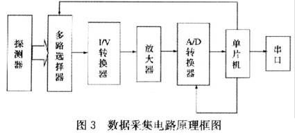系統(tǒng)的硬件組成分為以下幾個部分:環(huán)形光電探測器、數(shù)據(jù)選擇部分、電流電壓轉(zhuǎn)換部分、運算放大部分、模數(shù)轉(zhuǎn)換部分和中央單片機控制部分。