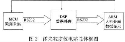 激光粒度儀電路總體框圖如圖2所示。采集電路采集到的數(shù)據(jù)經(jīng)過RS232串口傳輸給DSP,經(jīng)過DSP的運算后,再把DSP處理后得到的結(jié)果數(shù)據(jù)RS232經(jīng)過串口傳輸給ARM處理器,在ARM處理器的觸摸屏界面上顯示結(jié)果。