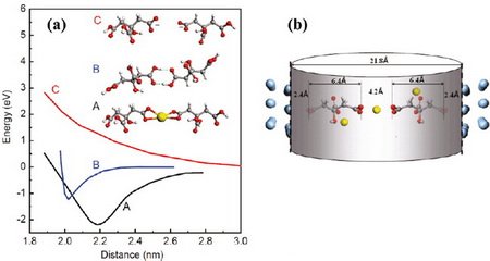 圖三:形成納米孔的分子水平微觀物理機(jī)制,左圖為能量極小值,右圖為分子大小與孔直徑關(guān)系