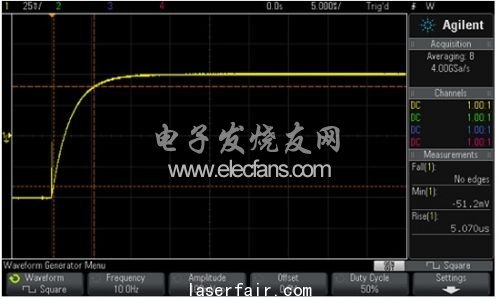 波形發(fā)生器的上升時間把可測得的最小電感值限定為10uH,其上限取決于電感的DCR。DCR過高時,示波器無法自動測量下降時間。在這種情況下需要手動測量下降時間。