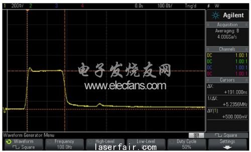 對(duì)于電纜測(cè)試,波形發(fā)生器可配置為輸出一個(gè)100Hz、0V~1V的方波,如圖10所示。取平均法可以降低噪聲;觸發(fā)點(diǎn)的位置設(shè)在左側(cè)。使用光標(biāo)對(duì)波形參數(shù)進(jìn)行手動(dòng)測(cè)量。這種測(cè)試方法等效于一個(gè)低速時(shí)域反射計(jì)(TDR)。