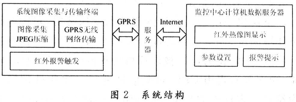 整個(gè)系統(tǒng)硬件結(jié)構(gòu)主要分為前端和中心端。前端圖像采集與傳輸系統(tǒng)是基礎(chǔ)前提,其結(jié)構(gòu)和性能直接決定了整個(gè)系統(tǒng)性能的好壞。前端硬件主要由五部分組成:主控制模塊、圖像采集模塊、圖像壓縮模塊、GPRS無線傳輸模塊以及紅外報(bào)警模塊。中心端即監(jiān)控中心計(jì)算機(jī)數(shù)據(jù)服務(wù)器與前端硬件系統(tǒng)起著承上啟下的作用。其結(jié)構(gòu)框圖如3所示。