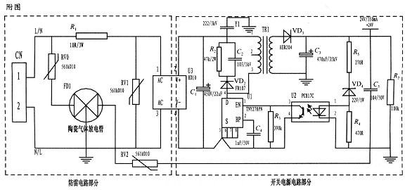 陶瓷氣體放電管的通流容量根據(jù)要求的通流容量選擇,電路采用3RM470L-7.5-L,通流量為5000A。線繞電阻R1起限流分壓作用;貼片整流模塊為開關電源電路前端整流作用,C1為高壓濾波電容,Y1為去耦電容,電阻R2和電容C2及VD2組成開關電源芯片MOS管的吸收鉗位電路,保護芯片,開關電源芯片采用PI公司的TNY27系列,TR1為高頻變壓器,VD3、C3構成高頻變壓器次級濾波,U2、VD4、R3、R4、R5構成開關電源電路的反饋電路,可將變壓器次級輸出電壓穩(wěn)定在設計值,此防雷抗浪涌電路在實際使用中取得了較好的效果。