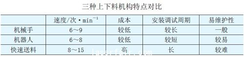 機(jī)械手上下料的方式出現(xiàn)較早,但由于沒(méi)有明顯的優(yōu)勢(shì),現(xiàn)在機(jī)械手上下料其訂貨已經(jīng)越來(lái)越少。由于工業(yè)機(jī)器人發(fā)展成熟并且易于維護(hù),機(jī)器人上下料已經(jīng)越來(lái)越成為預(yù)算并不充裕的廠(chǎng)家首選。而快速送料是近10年逐漸興起的,其技術(shù)還不是十分成熟,但由于其速度上的巨大優(yōu)勢(shì),以及能夠和高檔壓力機(jī)緊密結(jié)合的特點(diǎn),使其必將在未來(lái)的沖壓行業(yè)中扮演重要角色。三種上下料機(jī)構(gòu)特點(diǎn)對(duì)比見(jiàn)下表所示。