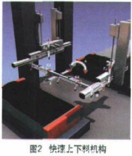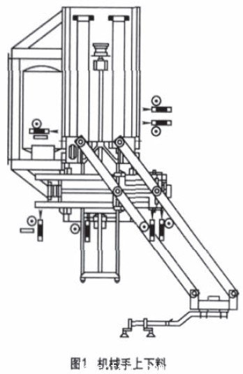 機(jī)械手上下料的自動(dòng)化機(jī)構(gòu)(見(jiàn)圖1)一般包含拆垛裝置、對(duì)中裝置、上料機(jī)械手、下料機(jī)械手、穿梭小車(chē)等部分。其中上下料機(jī)械手和穿梭小車(chē)一般包含2~3個(gè)運(yùn)動(dòng)軸,由伺服電動(dòng)機(jī)驅(qū)動(dòng)。世界上生產(chǎn)機(jī)械手的廠(chǎng)家有美國(guó)的I S I、日本的小矢部、瑞典的A B B和臺(tái)灣的金峰等。