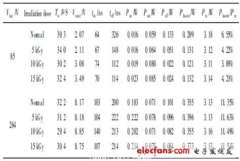 從表2中可以看出, 在85 V 交流輸入電壓下,輻照之后的APT13003E 比未輻照的APT13003E 的關(guān)斷延時(shí)有了大幅的減小, 因此關(guān)斷損耗大幅的減小, 如輻照為10 kGy的管子的關(guān)斷損耗減小為未輻照管子的1 /6; 導(dǎo)通延時(shí)有所增加, 但增加的幅度較小, 導(dǎo)通損耗有較小的增加; 飽和壓降隨輻照劑量的增加而增加, 因此通態(tài)損耗隨輻照劑量的增加而增加。開通損耗、通態(tài)損耗的增加與關(guān)斷損耗的減小是一對矛盾, 因此必須選擇合適的輻照劑量, 才能使開關(guān)晶體管總的損耗最小。