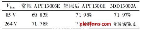 表3是AP3765序列充電器中采用經(jīng)過10 kGy電子輻照的APT13003E 及3DD13003A 在85 V 和230 V 輸入電壓下輸出負(fù)載電流分別是0. 15 A、0.30 A、0. 45 A、0. 60 A 系統(tǒng)平均效率的結(jié)果。從表3中可以看出, 10 kGy電子輻照后的APT13003E的效率與3DD13003A 的效率基本相同。