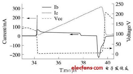 而在264 V輸入電壓下, 輻照后關(guān)斷損耗只有較小幅度的減小, 因此總損耗基本不變, 系統(tǒng)效率也沒有改善。如圖4 和圖5 分別為未經(jīng)輻照的APT13003E 在85 V 和264 V輸入電壓下基極電流、集電極電壓和電流的波形。比較圖4和圖5中可以看出, 在264 V 輸入電壓條件下導(dǎo)通時(shí)集電極電流的尖峰比起85 V 時(shí)要大很多, 這是因?yàn)閷?dǎo)通時(shí)變壓器寄生電容充電電壓增大了2. 1倍, 但充電時(shí)間只增加了約0. 6倍, 所以充電電流就會(huì)大大增加, 這也導(dǎo)致了APT13003E 的導(dǎo)通損耗由85 V 下的0. 016W 變?yōu)?64 V下的0. 183W, 此時(shí)導(dǎo)通損耗占了總的損耗的大部分, 而電子輻照對導(dǎo)通損耗并沒有改善; 另一方面, 在APT13003E 關(guān)斷時(shí), 集電極電壓并沒有直接降到0, 而是先經(jīng)過一個(gè)近100 ns的電流“ 尾巴”之后, 才又下降到0, 此時(shí)集電極電壓已經(jīng)比較大了, 因此這個(gè)電流“尾巴”所造成的損耗占關(guān)斷損耗的比例較大。產(chǎn)生這個(gè)“尾巴”的原因是, 關(guān)斷開關(guān)晶體管時(shí), 由于管子的基區(qū)比較薄, 過大的基極電流引起較大的基區(qū)電位差, 使VBE 為負(fù)的情況下發(fā)射結(jié)局部正向偏置, 集電極電流遲遲降不下來。