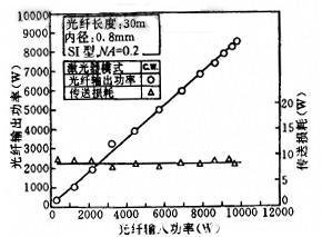 圖1示出采用30m光纖傳送l0kWYAG激光時的光束傳送特性。從圖中可以看出,入射功率10kW時傳送損失約800,大部分傳送損失都是由光纖端面的反射引起的。采用YAG激光器時,反射光近800W,這種處理很重要。采用該系統(tǒng)時,處處都要注意不要因反射光而使系統(tǒng)本身受到損傷。