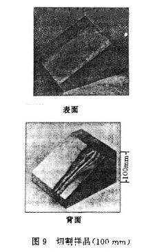 圖7示出切割板厚極限和激光輸出的關(guān)系。對0.05m/min及0.2m/min的切割速度進行了研究。從研究結(jié)果中可以看出,切割100mm的厚板時目前需要7~8kW的激光輸出。圖8示出用3.8kW切割厚45mm的碳鋼和SUS304所得到的切割剖面。從圖中可以看出,可進行彎曲幅度在2mm以下的高質(zhì)量分離切割。圖9示出板厚100mm時的圓錐狀樣品的切割結(jié)果。因此,如果板增厚,不可避免地會增大切割彎曲幅度。今后,應該研究通過改進光學系統(tǒng)及切割氣體的流向來提高切割質(zhì)量。