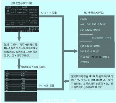 所以只要將齒輪加工一個(gè)齒的加工程式固化到子程序o0792中,并且在主程序執(zhí)行過(guò)程中,能夠不斷將y軸的分度數(shù)據(jù)賦值到變量地址#13125里,即可實(shí)現(xiàn)整個(gè)齒輪的連續(xù)淬火加工控制。
