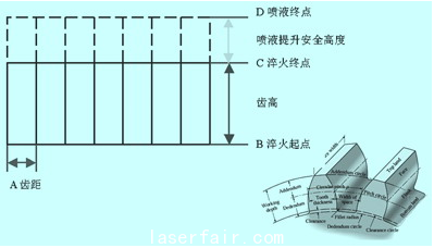 直齒淬火的一個(gè)淬火周期過(guò)程如下:z軸快速進(jìn)給到淬火起點(diǎn)b——x軸淬火感應(yīng)頭進(jìn)給到齒根——z軸以淬火速度提升,淬火感應(yīng)頭由淬火起點(diǎn)b上升到淬火終點(diǎn)c——z軸,繼續(xù)以快速進(jìn)給提升到噴液安全距離d——x軸淬火感應(yīng)頭退回到齒頂---y軸分度一個(gè)齒距a。直齒齒輪一個(gè)加工周期的g代碼編輯如下: