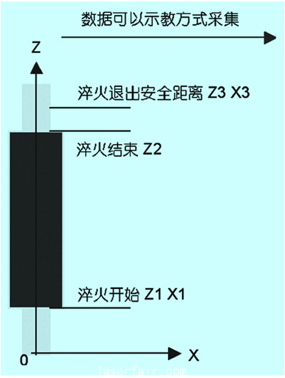 以下零件為例,淬火區(qū)域?yàn)榧t色部分,g代碼設(shè)計(jì)如下,其中x,z軸的數(shù)據(jù)(如下例中的z1、x1等)最終用戶可以通過(guò)圖紙計(jì)算得出,也可以通過(guò)cnc的示教功能采集得出。