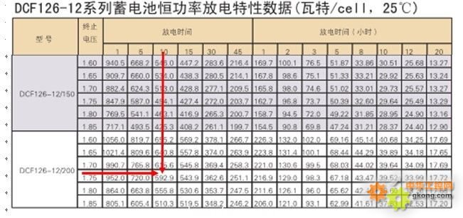 查表,可知,中達電池200AH/12電池10分鐘對應(yīng)的功率為592.9W(放電到1.75V時)