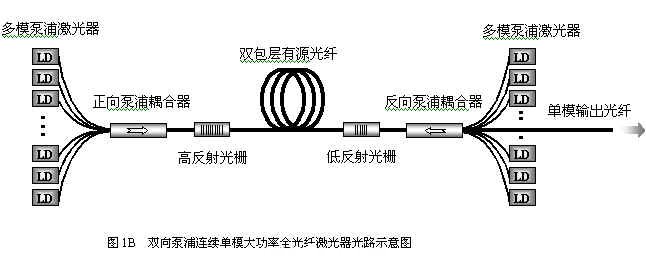 圖1B為典型的雙向泵浦連續(xù)單模大功率全光纖激光器的示意圖。雙向泵浦結(jié)構相對復雜,但有源區(qū)增益分布均勻性得到改善,可實現(xiàn)更高功率輸出。