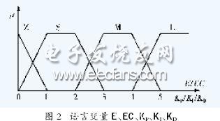 DC轅AC逆變電源控制的主要是輸出電壓及頻率的準(zhǔn)確性。頻率的準(zhǔn)確性由PWM發(fā)生器決定(它是一個(gè)存貯在存儲(chǔ)器內(nèi)的一個(gè)正弦輸出表格),只要觸發(fā)計(jì)算準(zhǔn)確就能達(dá)到設(shè)計(jì)要求。負(fù)載的變化使輸出電流產(chǎn)生變化,對(duì)于一定脈寬輸出的DC轅AC電源來(lái)說(shuō),勢(shì)必導(dǎo)致輸出電壓的變化。因此采用模糊控制規(guī)則根據(jù)不同的渣e渣和渣ec渣,對(duì)PID控制器的參數(shù)kp、ki、kd進(jìn)行在線自整定來(lái)調(diào)節(jié)輸出電壓。模糊控制器的輸入變量是偏差絕對(duì)值渣E渣、偏差變化率絕對(duì)值渣EC渣,