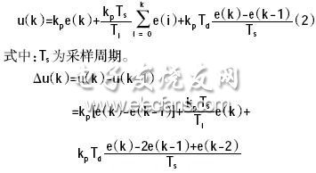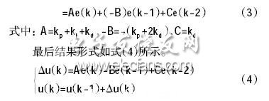 本文采用TMSLF2407實(shí)現(xiàn)數(shù)字PID控制,對(duì)式(1)進(jìn)行離散化,可得到式(2)PID 控制的離散形式,為了增加系統(tǒng)的可靠性,采用增量式PID控制算式,式(2)為第k 次PID控制器的輸出量,減去第k-1次PID 控制器的輸出量即可得到式(3)增量式PID 控制算式。