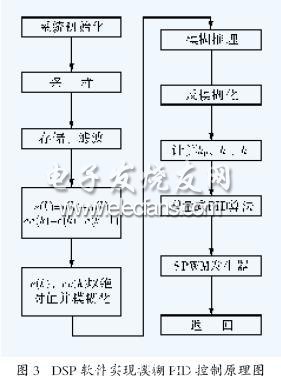 為了保證模糊PID 控制的實(shí)時(shí)性和準(zhǔn)確性,DSP在A/D采樣的中斷子程序中就調(diào)用模糊PID控制算法程序,立即計(jì)算出輸出控制量并送到被控對(duì)象,根據(jù)TMSLF2407 的性能,機(jī)器時(shí)鐘周期和中斷延時(shí)可以計(jì)算出本系統(tǒng)從采樣當(dāng)前實(shí)際輸出值到輸出控制量大約需要6.67 滋s ,這對(duì)于1ms一次的采樣來(lái)說(shuō)是足夠的,完全滿足實(shí)時(shí)性要求。程序流程圖如圖3所示。