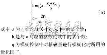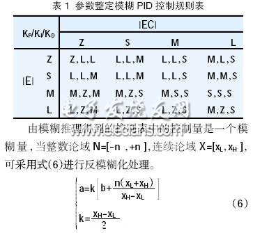 在本文中利用CRI法推理時(shí),控制過(guò)程是用查控制表來(lái)產(chǎn)生控制量的,在控制表中,模糊偏差量渣E渣、模糊偏差變化率渣EC渣,PID控制器的模糊比例增益系數(shù)KP、模糊積分增益系數(shù)KI和模糊微分增益系數(shù)KD都是用其對(duì)應(yīng)整數(shù)論域的元素來(lái)表示的。對(duì)于單個(gè)實(shí)時(shí)精確量利用式(5),得到的結(jié)果再四舍五入,就求出了對(duì)應(yīng)整數(shù)論域的相應(yīng)元素,從而實(shí)現(xiàn)了輸入量的模糊化。