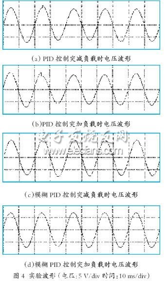圖4為實(shí)驗(yàn)波形,其中(a)、(b )為PID控制時(shí)突減負(fù)載、突加負(fù)載時(shí)的電壓波形。(c)、(d )為模糊PID控制時(shí)突減負(fù)載、突加負(fù)載的電壓波形,從實(shí)驗(yàn)結(jié)果可以看出采用模糊PID控制的方法與一般的PID 控制方法相比具有動(dòng)態(tài)響應(yīng)速度快、超調(diào)小,輸出穩(wěn)定后其幅值變化很小,突加、減負(fù)載時(shí)電壓變化幅值小的優(yōu)點(diǎn),因而能更有效地抑制負(fù)載突變或外界干擾對(duì)電壓的影響。