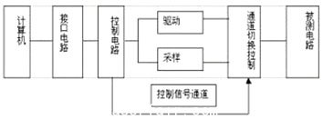 計算機主要用于控制測試系統(tǒng)以及對數(shù)據(jù)的分析,整理和保存。測試部分主要包括主控電路和8個輔助電路兩部分。測試部分的基本結(jié)構(gòu)如圖2所示: