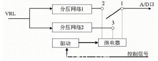 為提高測量精度,適應(yīng)更為廣泛的測量范圍,采用繼電器對分壓網(wǎng)絡(luò)進行換檔。電路如圖8