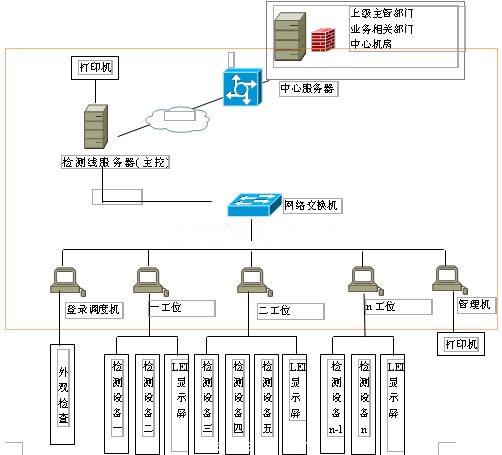 計算機聯(lián)網(wǎng)檢測系統(tǒng)以檢測線服務器為中心構(gòu)成檢測站局域網(wǎng)實現(xiàn)線內(nèi)資源共享,同時與上級主管部門及相關(guān)業(yè)務部門連成廣域網(wǎng),以實現(xiàn)信息的共享與職能的監(jiān)管。目前常用的網(wǎng)絡結(jié)構(gòu)為星型拓樸結(jié)構(gòu),網(wǎng)絡操作系統(tǒng)多采用Windows 2000 Server,而數(shù)據(jù)庫平臺則常見Oracle、 Microsoft SQL Server2000等大型關(guān)系數(shù)據(jù)庫。