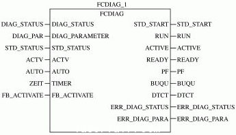 診斷和自啟動(dòng)程序在PC WORX 2.02中功能編程軟件Program Worx上開(kāi)發(fā),采用ST(結(jié)構(gòu)化文本)語(yǔ)言編程,編程后封裝成功能模塊FCDIAG(見(jiàn)圖1)。該模塊以診斷狀態(tài)寄存器、診斷參數(shù)寄存器作為輸入,經(jīng)過(guò)處理之后把診斷信息賦給全局外部變量ERR DIAG STATUS 和ERR DIAG_PAPA。自啟動(dòng)功能可以檢測(cè)故障是否清除,一旦檢測(cè)到故障已經(jīng)清除后,通過(guò)標(biāo)準(zhǔn)功能啟動(dòng)寄存器,啟動(dòng)總線運(yùn)行。