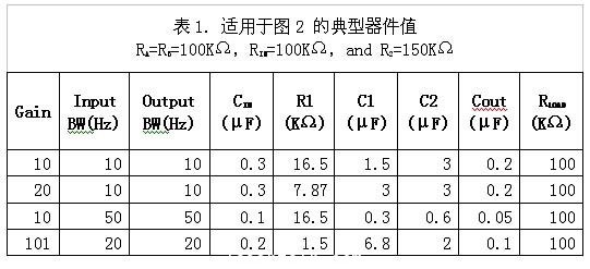 設(shè)計(jì)單電源運(yùn)算放大器電路,需要考慮輸入偏置電流誤差、電源抑制、增益、以及輸入與輸出線路帶寬等等。然而普通的應(yīng)用設(shè)計(jì)是可以通過(guò)查表來(lái)獲得,見表1。在單電源電壓為15V或12V時(shí)偏置分壓的兩個(gè)電阻通常選用100kΩ,這樣可以在電源消耗與輸入偏置電流誤差之間合理的折中。5V單電源偏置分壓電阻減小到一個(gè)比較低的值,例如42kΩ。還有些在3.3V應(yīng)用中偏置分壓電阻選在27kΩ左右。