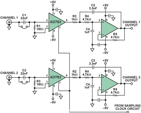 圖1所示為一個插入式附件的原理圖,它可以配合典型PC聲卡采樣使用。每個示波器通道使用一個高速采樣保持放大器 AD783 SHA的采樣信號由時鐘分頻器電路的數(shù)字輸出提供,下文將通過一個例子說明。AD783輸入由一個FET緩沖,因此可以使用簡單的交流/直流輸入耦合。在所示的兩個通道中,當直流耦合跳線開路且輸入為交流耦合時,1 MΩ電阻(R1和R3)提供直流偏置。采樣輸出由圖中所示的雙極點有源RC網(wǎng)絡低通濾波。該濾波器不必是一個有源電路,但所示的濾波器能夠提供有益的緩沖低阻抗來驅(qū)動PC聲卡輸入。