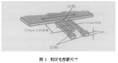 ADXL202是最新的、低重力加速度雙軸表面微機(jī)械加工的加速度計(jì),以模擬量和脈寬調(diào)制數(shù)字量2種方式輸出,并具有極低的功耗和噪音。表面微機(jī)械加工使加速度傳感器、信號(hào)處理電路高度集成于一個(gè)硅片上。和所有加速度計(jì)一樣,傳感器單元是差動(dòng)電容器,其輸出與加速度成比例。加速度計(jì)的性能依賴于傳感器的結(jié)構(gòu)設(shè)計(jì)。差動(dòng)電容是由懸臂梁構(gòu)成,而懸臂梁是由很多相間分布的指狀電容電極副構(gòu)成,一副指狀電容電極可簡(jiǎn)化為圖1所示的結(jié)構(gòu)。每個(gè)指狀電極的電容正比例于固定電極和移動(dòng)電極之間的重疊面積以及移動(dòng)電極的位移。顯然,這些都是很小的電容器,并且,為了降低噪聲和提高分辨力,實(shí)際上需要盡可能大的差動(dòng)電容。