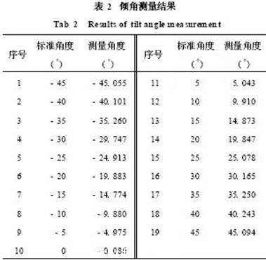 從表2可以算出:傾角最大誤差為- 0. 26°~0. 25°,而平均角度誤差為±0. 135°, 分別為滿量程的0. 57 %和0. 30 %。