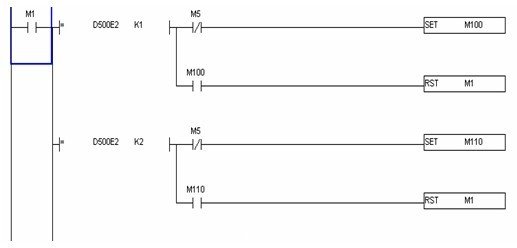 當(dāng)自動(dòng)運(yùn)行開始M1標(biāo)志有效,E2是自動(dòng)程序順序指針初始值是1代表程序執(zhí)行用戶所輸入的第一個(gè)動(dòng)作,每執(zhí)行一個(gè)動(dòng)作E2自增一也就是D500E2地址偏移一個(gè)位置。M100為調(diào)用子程序標(biāo)志。每一個(gè)動(dòng)作就是一個(gè)子程序。