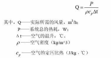 如果系統(tǒng)采用強迫風(fēng)冷的散熱方式,選擇合適的散熱風(fēng)機直接決定了系統(tǒng)散熱狀況。要進行風(fēng)機選型,首先需要確定系統(tǒng)所需要的散熱風(fēng)量,通過下面的公式計算: