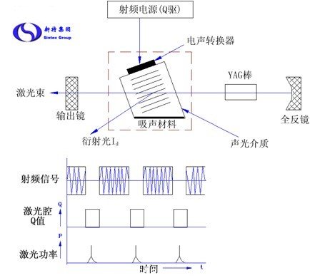 聲光Q開關(guān)是利用聲光相互作用以控制光腔損耗的Q開關(guān)技術(shù)。聲光調(diào)Q是通過電聲轉(zhuǎn)換形成超聲波使調(diào)制介質(zhì)折射率發(fā)生周期性變化, 對(duì)入射光起衍射作用, 使之發(fā)生衍射損耗,Q值下降, 激光振蕩不能形成。在光泵激勵(lì)下其上能級(jí)反轉(zhuǎn)粒子數(shù)不斷積累并達(dá)到飽和值, 之后突然撤除超聲場, 衍射效應(yīng)立即消失, 腔內(nèi)Q值猛增, 激光振蕩迅速恢復(fù), 其能量以巨脈沖形式輸出。這是一種廣泛應(yīng)用的Q開關(guān)方式,其主要優(yōu)點(diǎn)是重復(fù)頻率高,性能穩(wěn)定可靠。