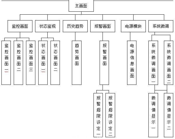 (1)系統(tǒng)功能設(shè)計(jì):44個數(shù)字量采集顯示,故障判斷;6個電源模塊的數(shù)據(jù)采集顯示、顯示電源模塊的工作狀態(tài)并判斷報(bào)警;39路模擬量顯示、并判斷上下限報(bào)警;顯示報(bào)警畫面、報(bào)警信息、當(dāng)前報(bào)警、報(bào)警頻次;報(bào)警上下限設(shè)定;數(shù)據(jù)微調(diào)功能,并且顯示微調(diào)值;歷史趨勢圖顯示;不同畫面開啟權(quán)限設(shè)定; 以上有必要說明的是數(shù)據(jù)微調(diào)功能,由于現(xiàn)場的一次測量元件測量會有誤差,而且此誤差是固定的,短時(shí)間內(nèi)是不變的,所以在程序當(dāng)中增加這部分功能,使最終顯示出來的數(shù)值是消除誤差之后的值;