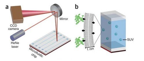 為了檢驗BSI的準確性,研究人員制造了一種含有GM1小蛋白質的合成膜,霍亂毒素要進入細胞,主要結合對象就是這種小蛋白質。他們把霍亂毒素B和這些膜混合,檢測出的結合力結果與用其他方法所得到的結果一致。為了進一步確認,他們還用了一種和胸腺癌相關的天然分離膜和3種分別與疼痛、發(fā)炎和神經傳導素GABA(用于放松、睡眠和調節(jié)緊張)相關的蛋白質膜進行檢驗,把包含這些蛋白質的膜和對應結合分子相混合,用BSI技術測得的值也和用其他方法得到的結果一樣。