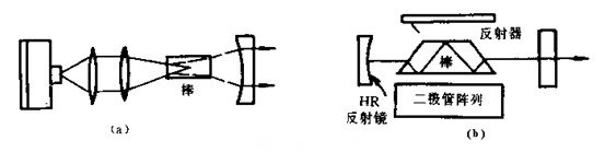 半導(dǎo)體激光器泵浦固體激光器的結(jié)構(gòu),有如圖(1(a)所示的端泵浦方式和圖(1(b)所示的側(cè)泵浦方式。從固體工作物質(zhì)來看,有圓柱形和板條狀兩種。端泵浦方式因半導(dǎo)體激光模式與固體工作物質(zhì)中的激光振蕩模式匹配良好,所以“泵”與激光器之間的耦合效率高。這種激光器的閾值低、效率高,但輸出功率受到單個激光二極管輸出功率的限制。而利用半導(dǎo)體激光器陣列側(cè)泵浦固體工作物質(zhì),雖然效率降低,但在脈沖或連續(xù)運轉(zhuǎn)時,都能獲得較高的輸出功率。